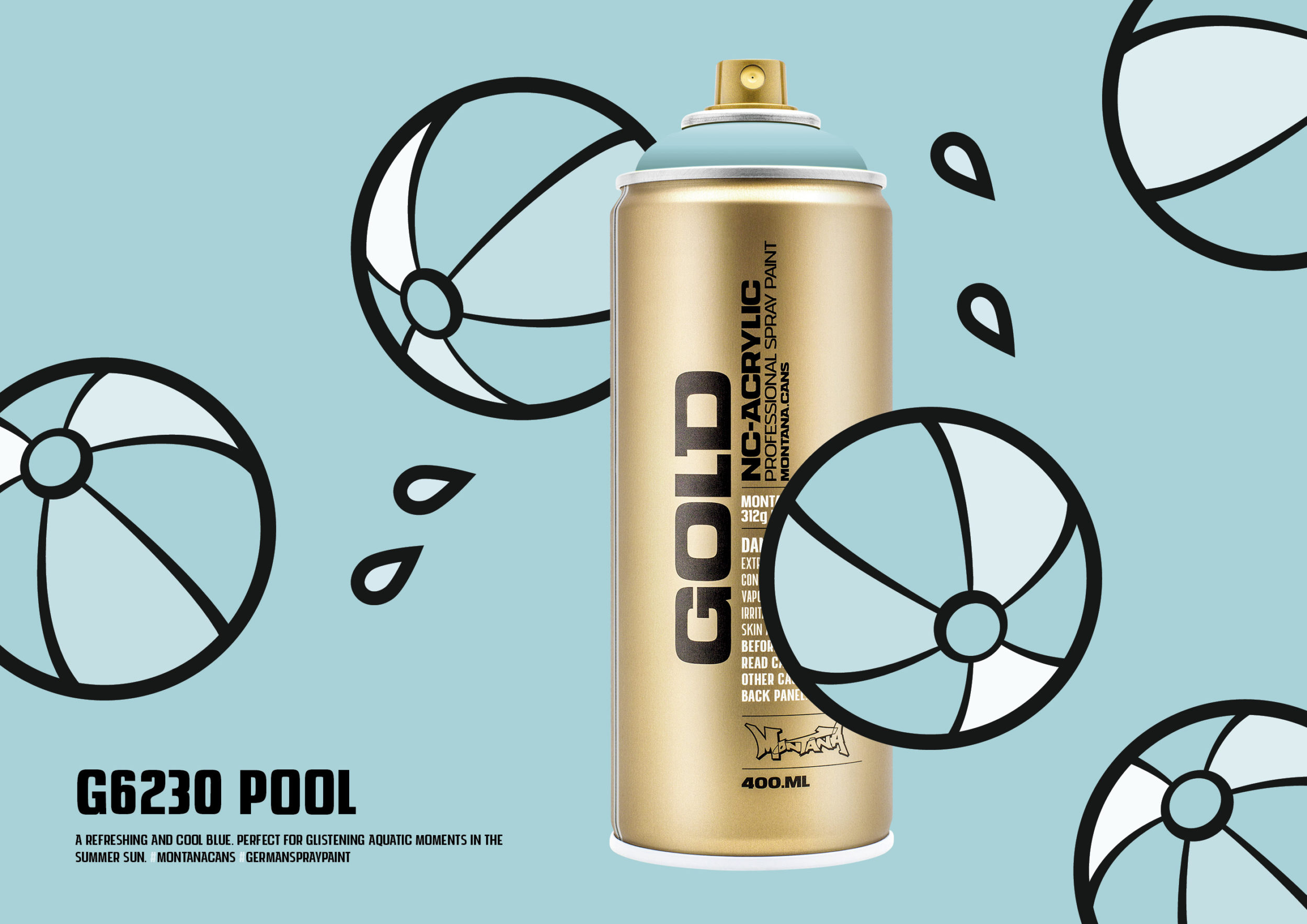 Montana GOLD color G6230 Pool – A refreshing and cool blue. Perfect for glistening aquatic moments in the summer sun! Make your choice among 215 tones in Montana GOLD’s flowing color system. One of the largest and most concise color ranges for artists available in spray paint.