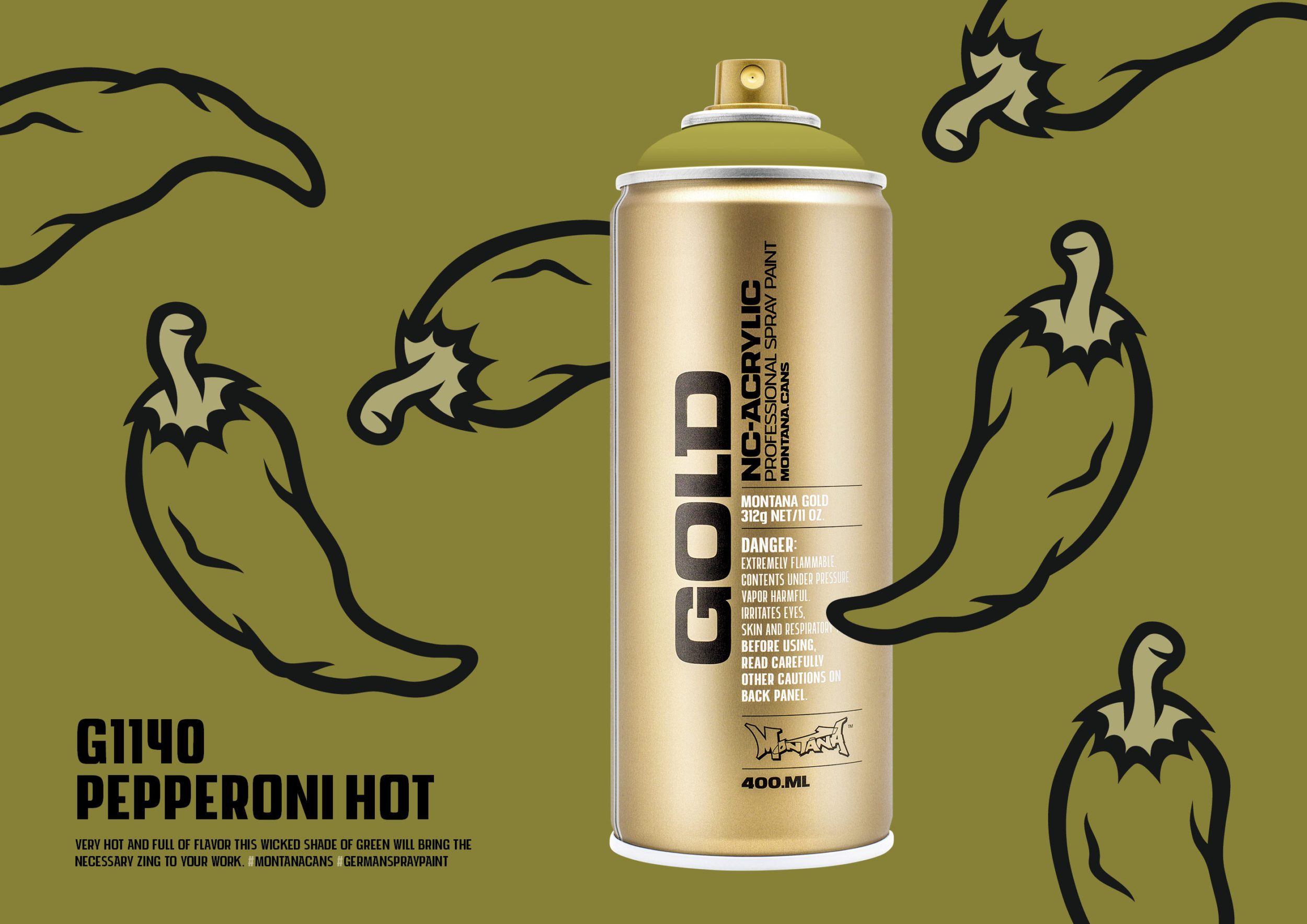 Montana GOLD color G1140 PEPPERONI HOT – Very hot and full of flavor this wicked shade of green will bring the necessary zing to your work… Make your choice among 215 tones in Montana GOLD’s flowing color system. One of the largest and most concise color ranges for artists available in spray paint. Montana GOLD G1140 PEPPERONI HOT