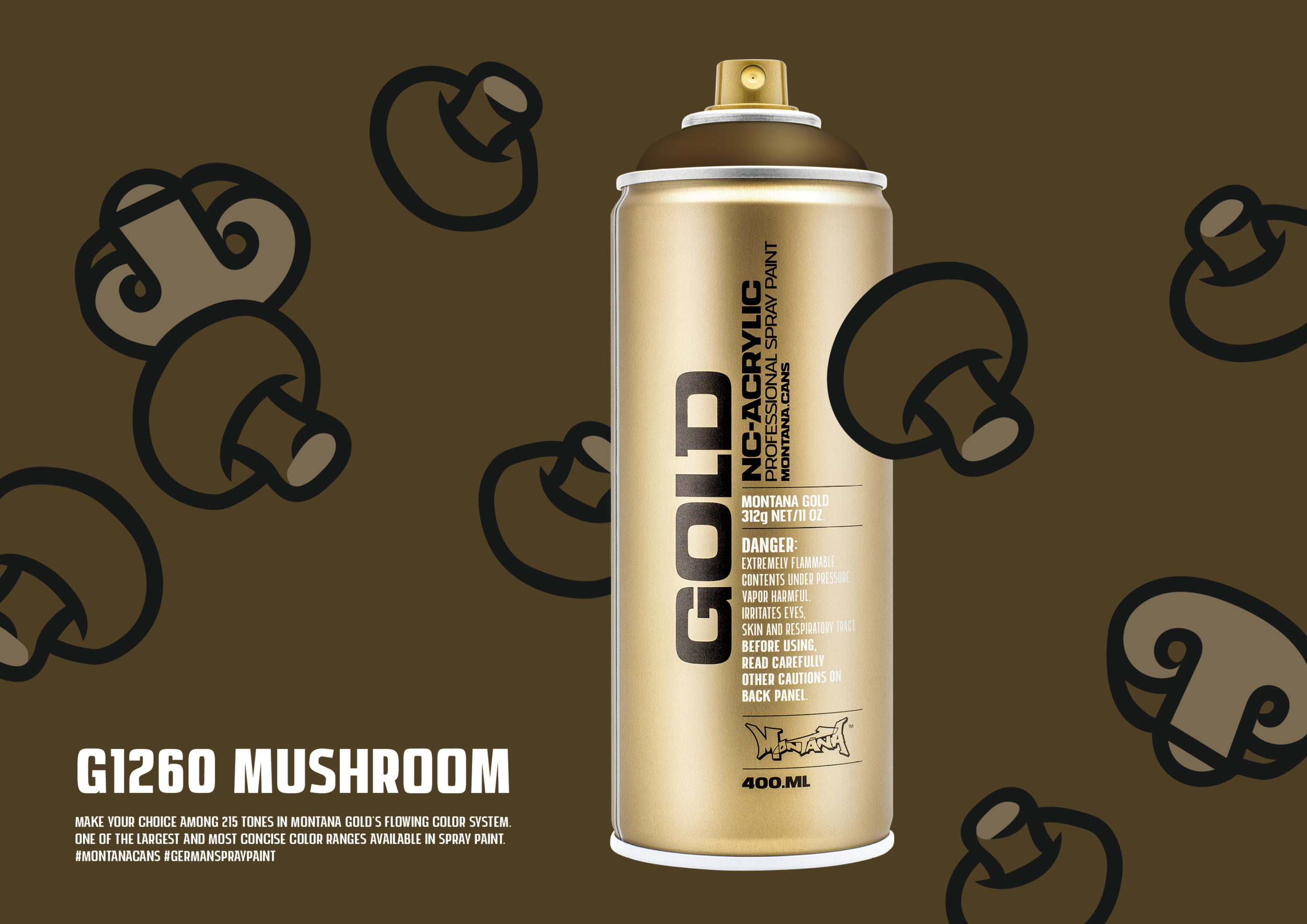 Montana GOLD color G1260 MUSHROOM – An earthy-brown tone, sombre, shaded and affectionate. This subdued shade of brown brings stark contrast and grounding to your compositions… Make your choice among 215 tones in Montana GOLD’s flowing color system. One of the largest and most concise color ranges for artists available in spray paint. Montana GOLD G1260 MUSHROOM
