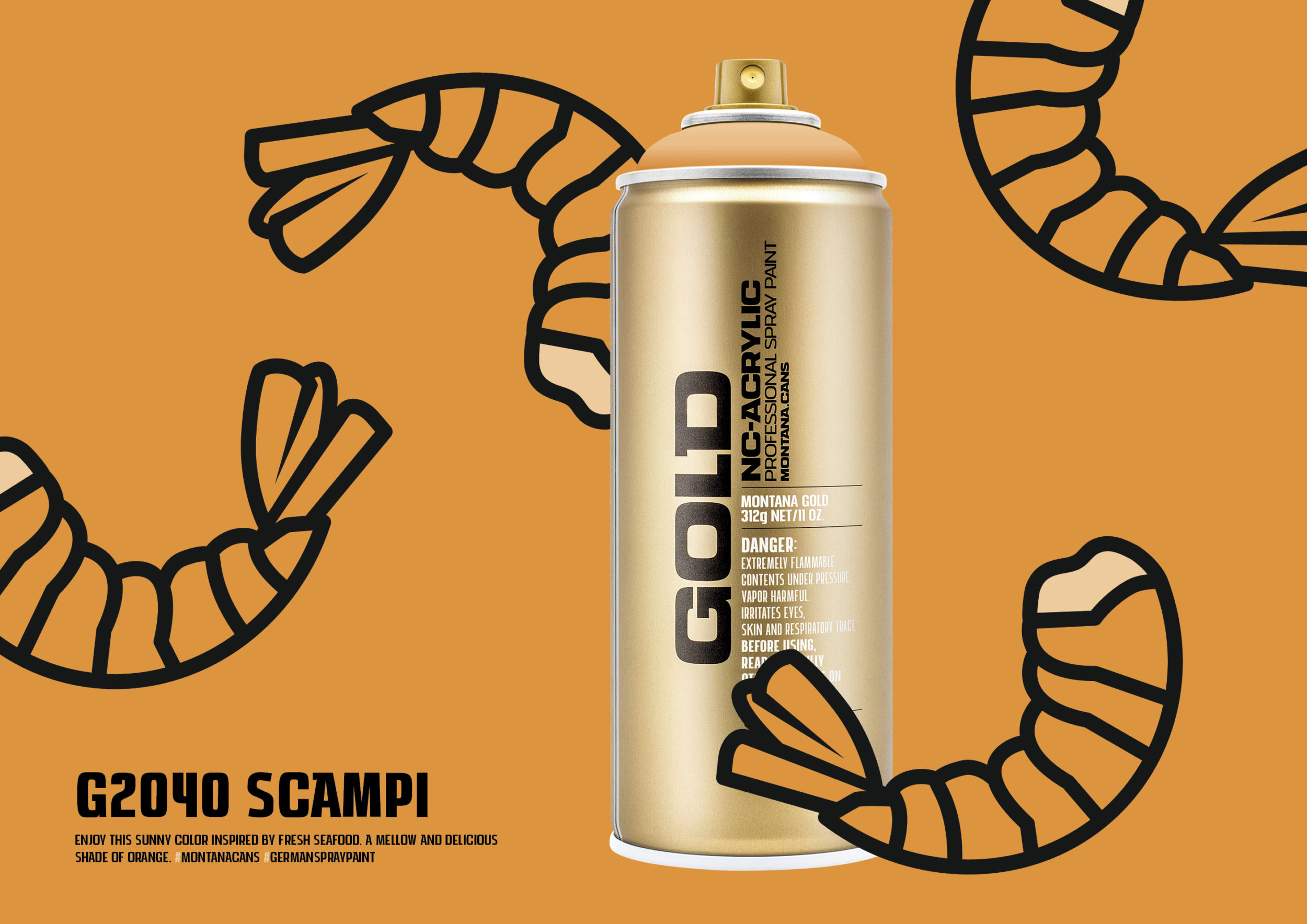 Montana GOLD color G2040 SCAMPI – Enjoy this sunny color inspired by fresh seafood. A mellow and delicious shade of orange… Make your choice among 215 tones in Montana GOLD’s flowing color system. One of the largest and most concise color ranges for artists available in spray paint. Montana GOLD G2040 SCAMPI