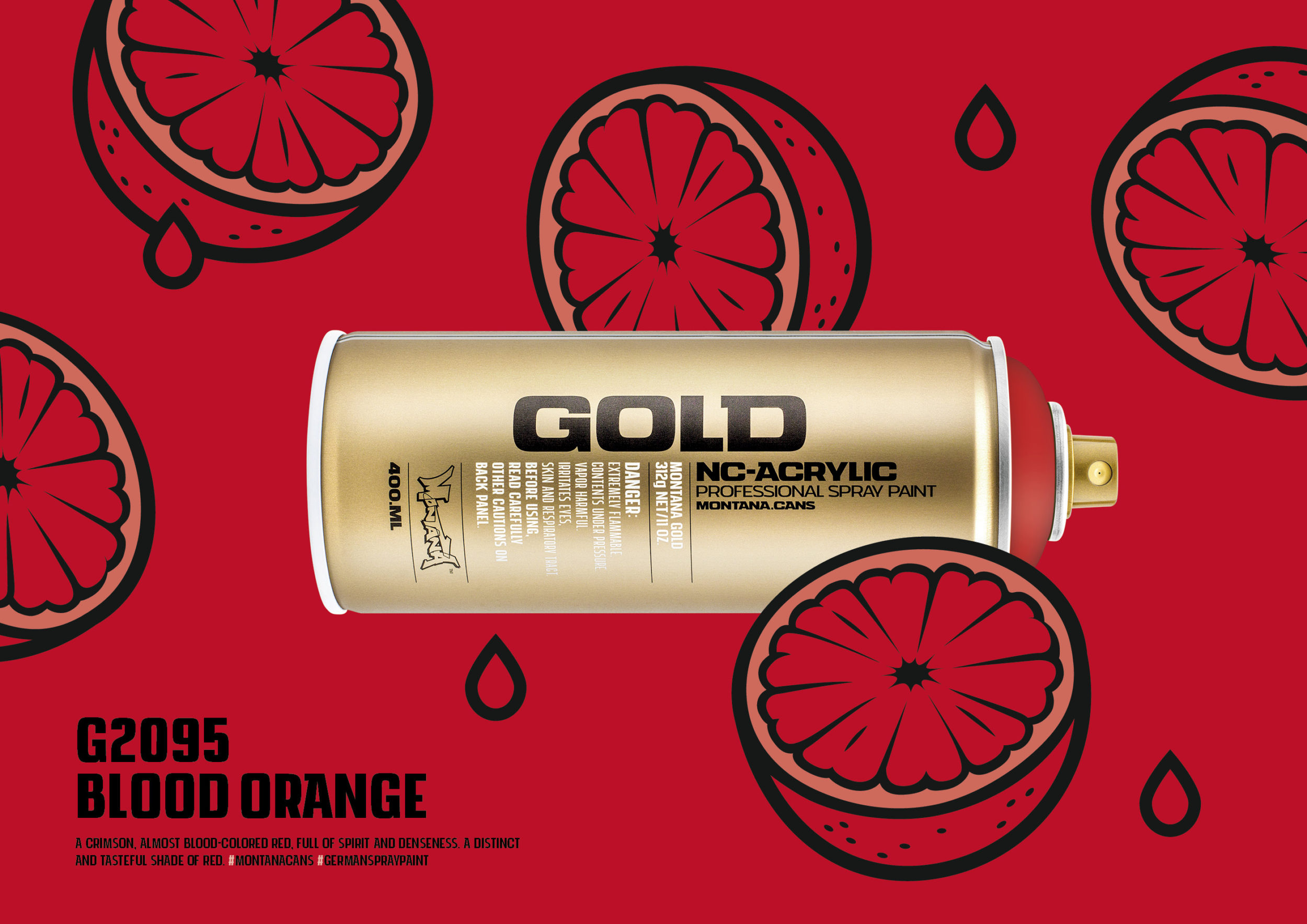 Montana GOLD color G2095 BLOOD ORANGE – A crimson, almost blood-colored red, full of spirit and denseness. A distinct and tasteful shade of red… Make your choice among 215 tones in Montana GOLD’s flowing color system. One of the largest and most concise color ranges for artists available in spray paint. Montana GOLD G2095 BLOOD ORANGE
