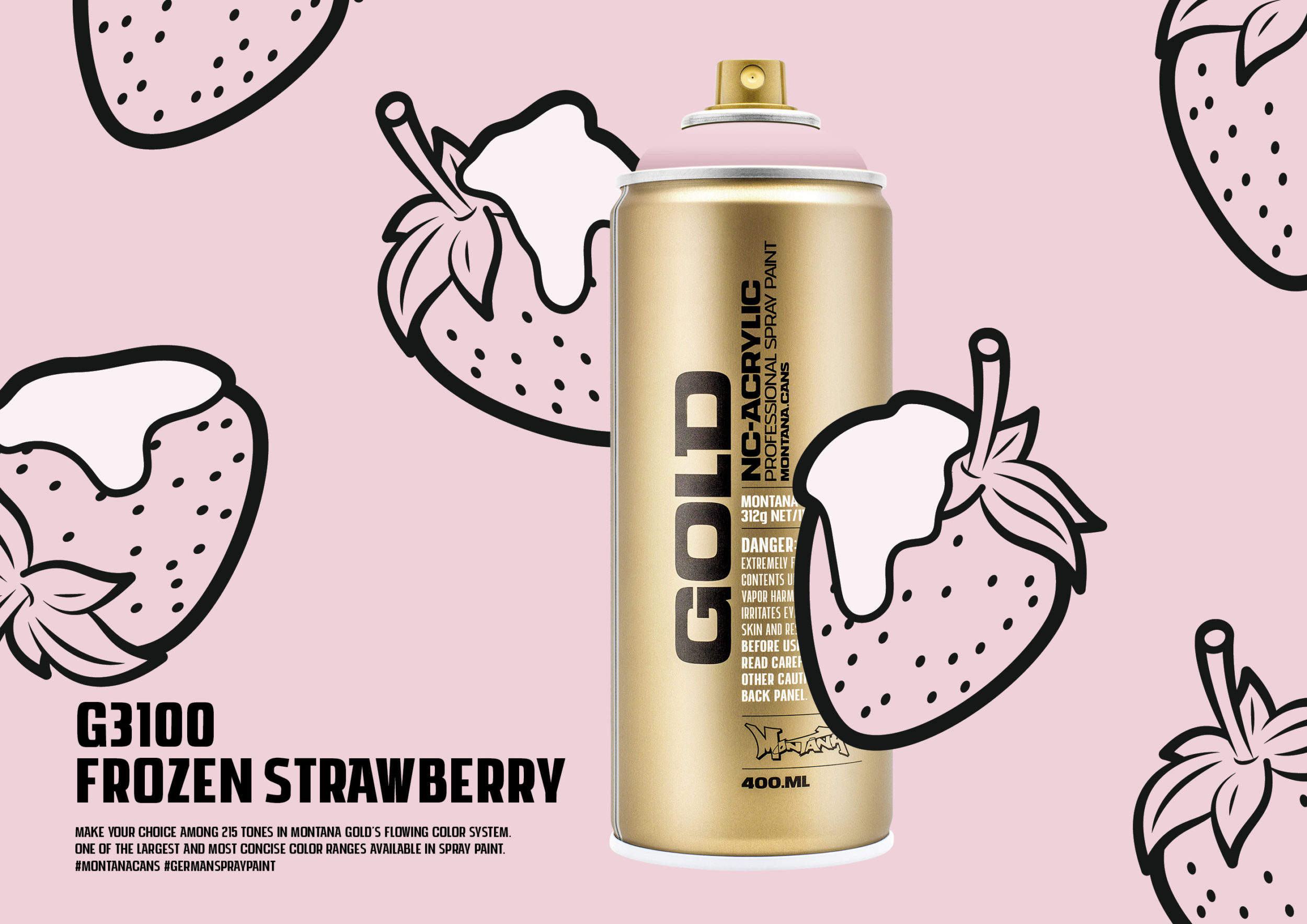 Montana GOLD color G3100 FROZEN STRAWBERRY – Crisp and creamy at the same time – with a nice refridgerated freshness. Put your creations in cool place with this snappy pink hue… Make your choice among 215 tones in Montana GOLD’s flowing color system. One of the largest and most concise color ranges for artists available in spray paint. Montana GOLD G3100 FROZEN STRAWBERRY