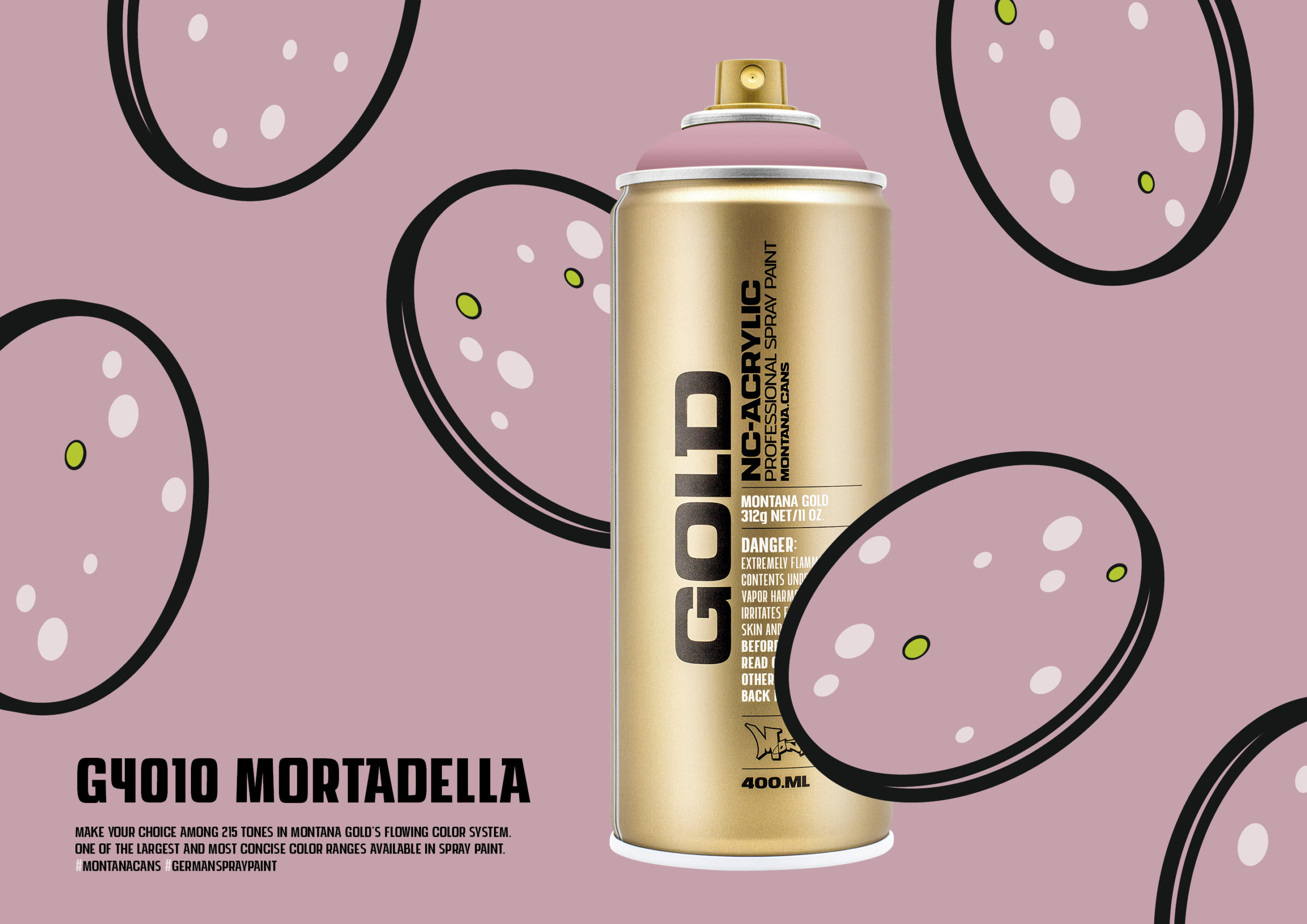 Montana GOLD color G4010 MORTADELLA – Grab a bite of this mouth-watering delicacy from the Montana Deli. Just the right amount of Phat – and all the taste!… Make your choice among 215 tones in Montana GOLD’s flowing color system. One of the largest and most concise color ranges for artists available in spray paint. Montana GOLD G4010 MORTADELLA