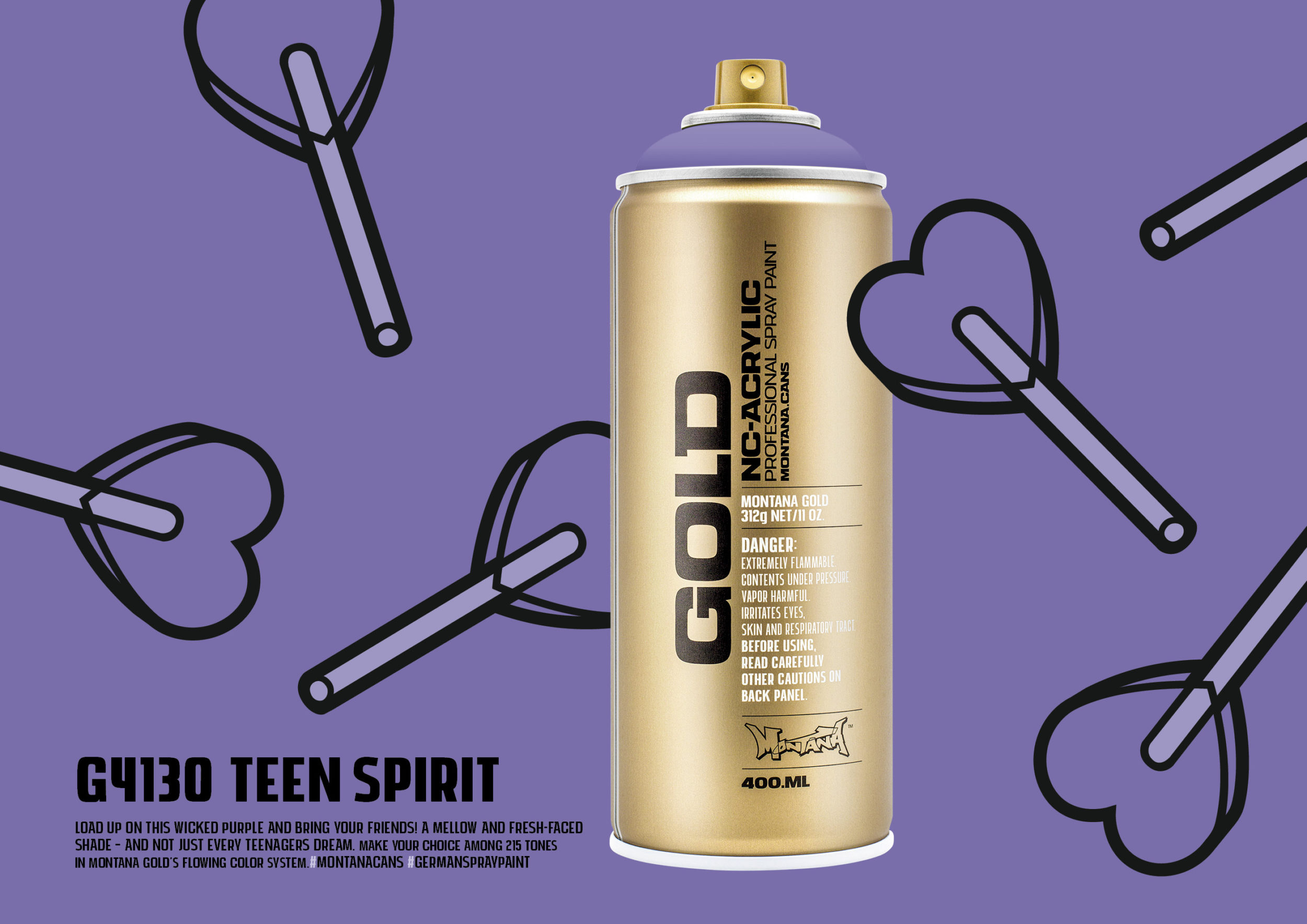 Montana GOLD color G4130 TEEN SPIRIT – Load up on this wicked purple and bring your friends! A mellow and fresh-faced shade – and not just every teenagers dream… Make your choice among 215 tones in Montana GOLD’s flowing color system. One of the largest and most concise color ranges for artists available in spray paint. Montana GOLD G4130 TEEN SPIRIT