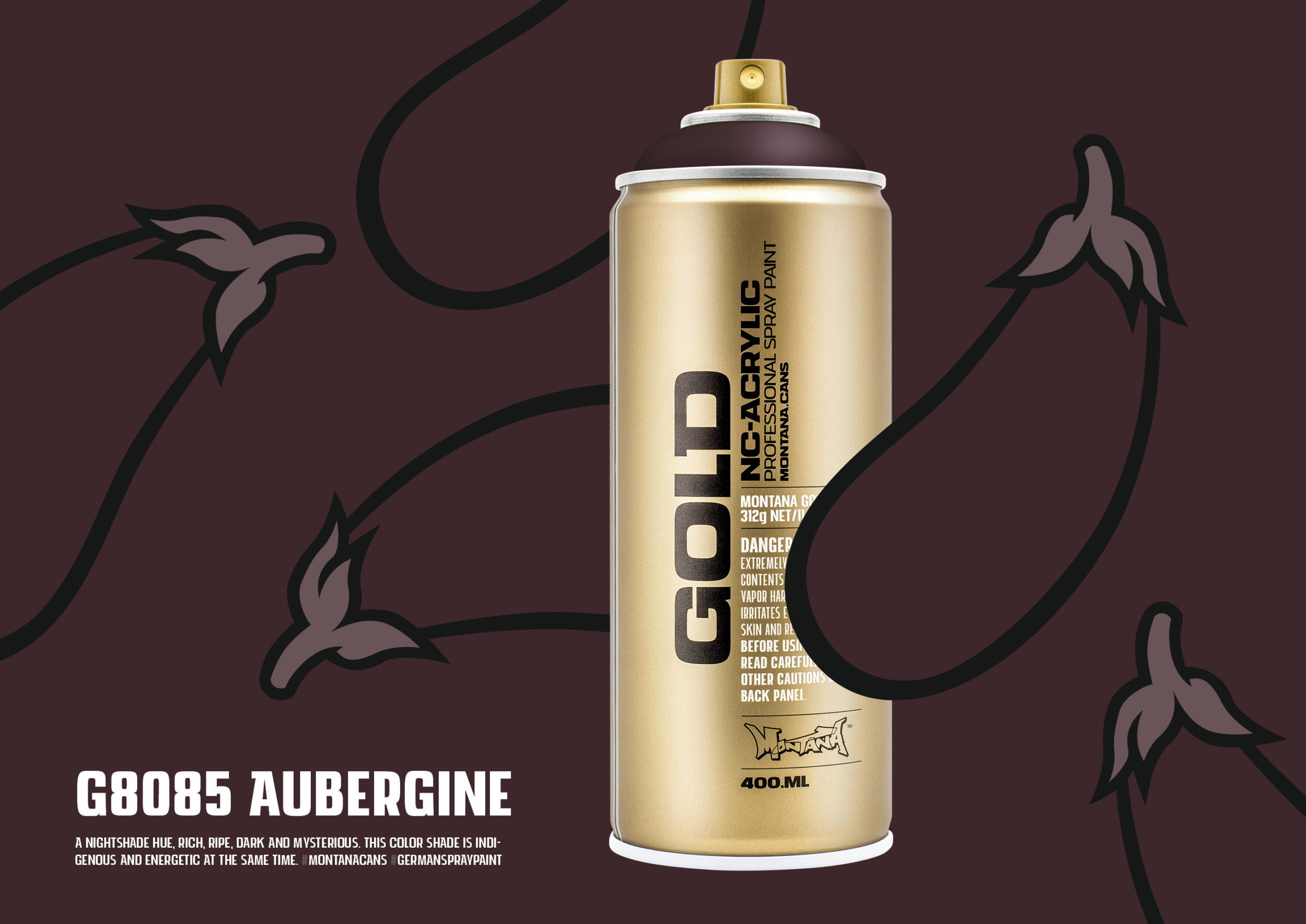 Montana GOLD color G8085 AUBERGINE – A nightshade hue, rich, ripe, dark and mysterious. This color shade is indigenous and energetic at the same time… Make your choice among 215 tones in Montana GOLD’s flowing color system. One of the largest and most concise color ranges for artists available in spray paint. Montana GOLD G8085 AUBERGINE